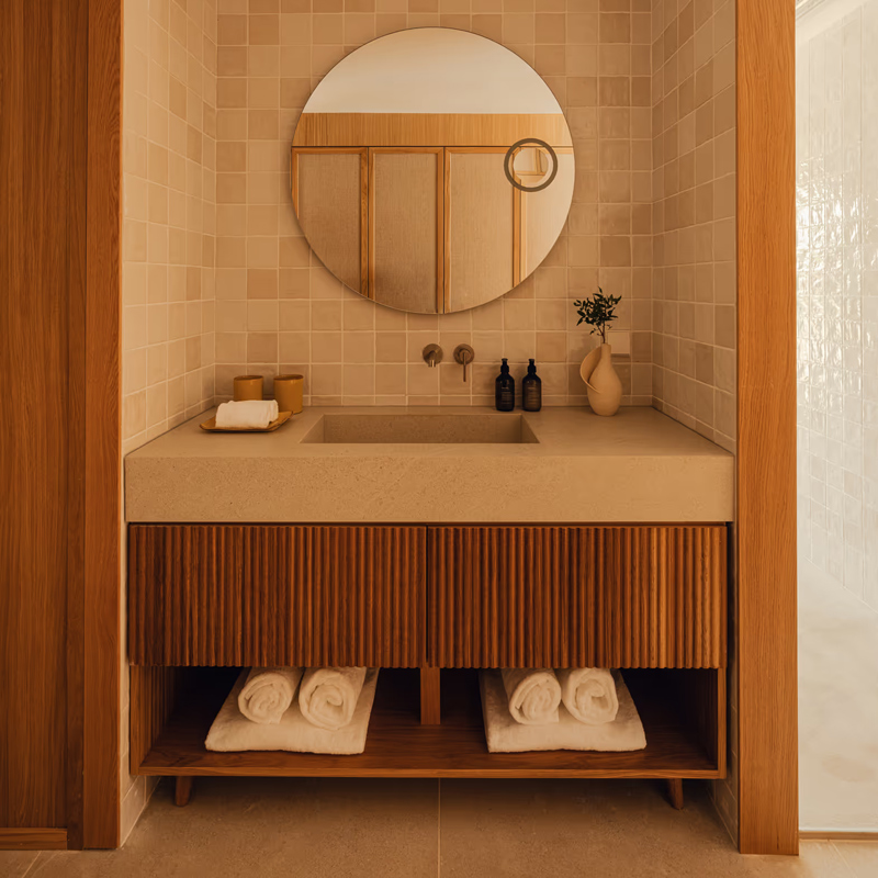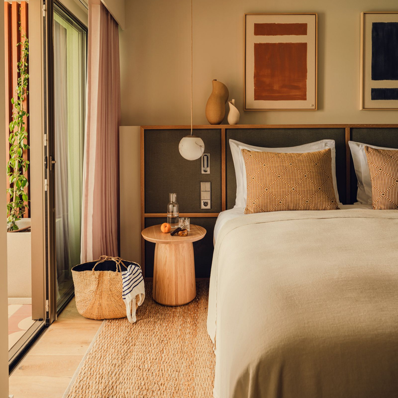 The architecture unfolds across multiple low-rise buildings clad in natural stone, designed to blend seamlessly into the coastal landscape. Interiors reflect the same intention — a palette of soft neutrals, raw textures, wood, and linen that echo the surrounding beaches and mountains. Floor-to-ceiling windows invite the outside in, flooding spaces with Mediterranean light, while mid-century influences subtly shape the furniture and atmosphere. The result is a form of quiet, tactile luxury — elegant yet grounded, contemporary yet timeless.