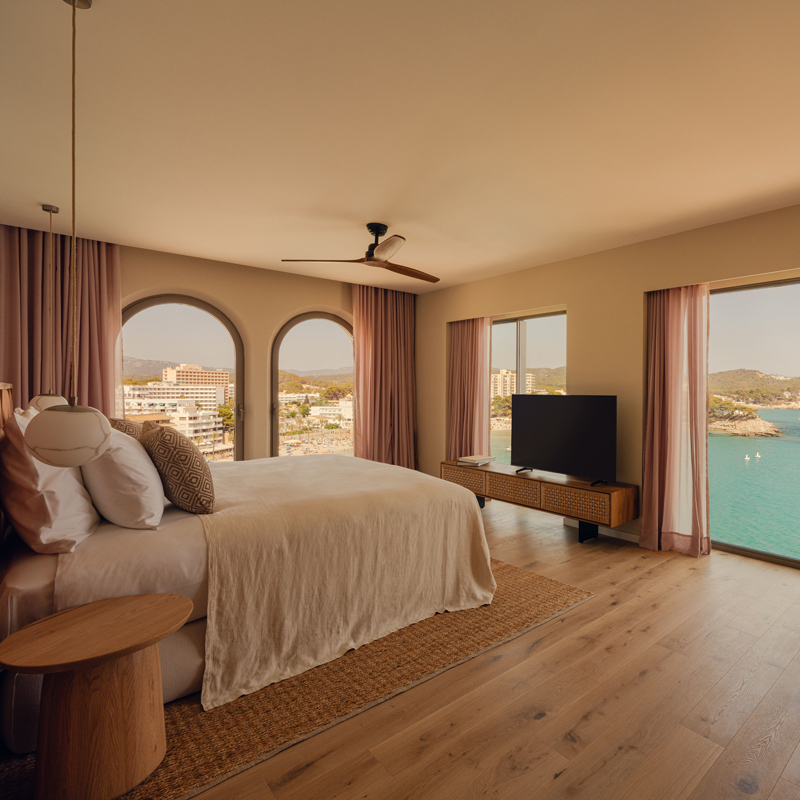 Set in Peguera, facing the endless blue of the Mediterranean, Aethos Mallorca is anchored in one of the island’s most luminous landscapes. The hotel opens directly onto the sea, with uninterrupted views that stretch across the horizon, while the surrounding hills create a natural sense of intimacy and protection. This duality — openness and retreat — defines the experience. Here, the sound of waves replaces the noise of the world, and the light shifts constantly, from crisp morning clarity to golden, almost cinematic sunsets.