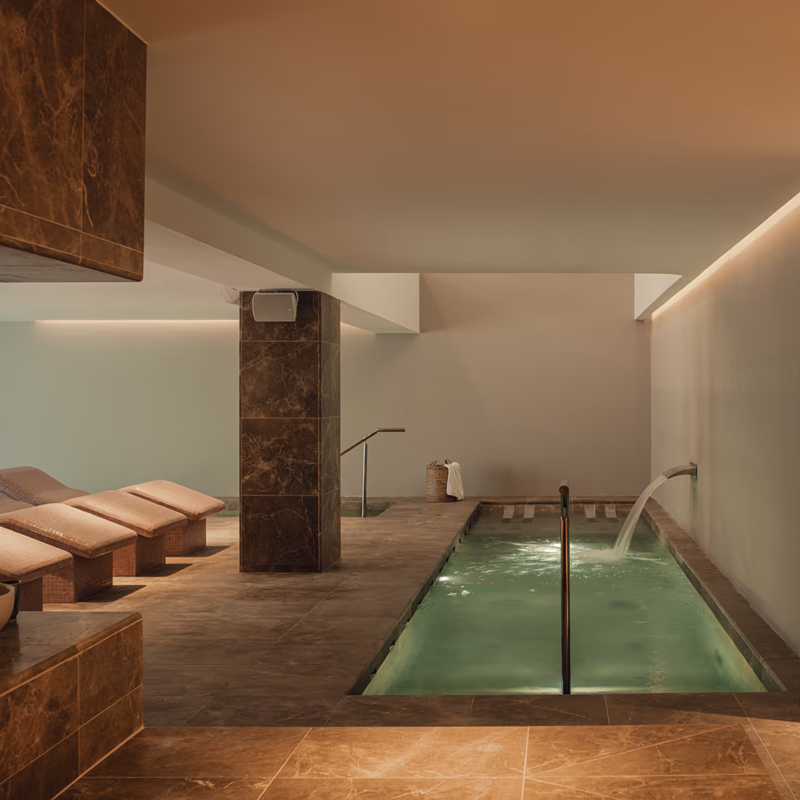 Well-being lies at the core of the Aethos experience. The spa is conceived as a light-filled sanctuary, where water, heat, and silence guide a journey of restoration. The thermal circuit includes a Finnish sauna, steam bath, sensory showers, jacuzzi, cold plunge, and heated pool with hydromassage features. Every element is designed to stimulate circulation, release tension, and restore balance. Beyond the spa, the outdoor infinity pool overlooking the sea becomes a ritual in itself — whether at sunrise or in the golden glow of late afternoon. Yoga, Pilates, and sound healing sessions complete this holistic approach to well-being.