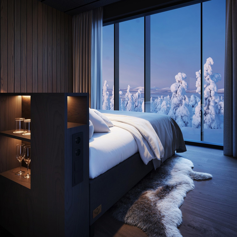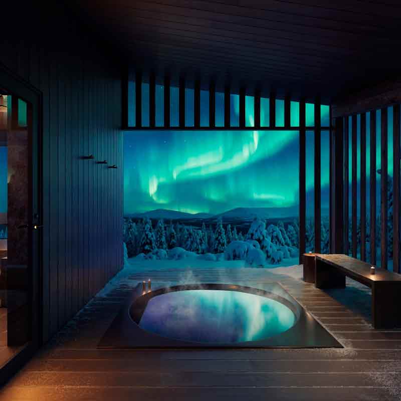 Wellness at Arcora extends beyond the traditional spa concept, becoming a holistic immersion into Arctic nature. The resort will feature a panoramic wellness area with saunas, hot tubs, and a rooftop infinity pool overlooking the wilderness. Experiences are deeply integrated into the stay, from husky safaris and reindeer encounters to snowmobiling and hiking, all starting directly from the hotel. Every element is designed to reconnect guests with nature, not through spectacle, but through authenticity, silence, and presence. This is wellness as a state of being, shaped by fresh air, vast landscapes, and the slow rhythm of the Arctic.