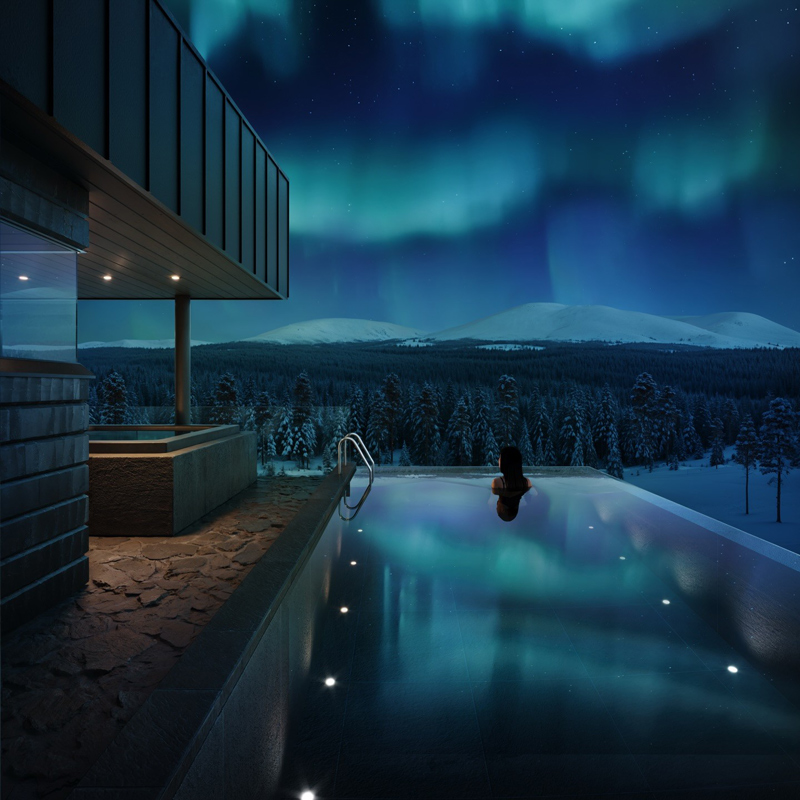 – Rooftop infinity pool, spa, and immersive Arctic experiences