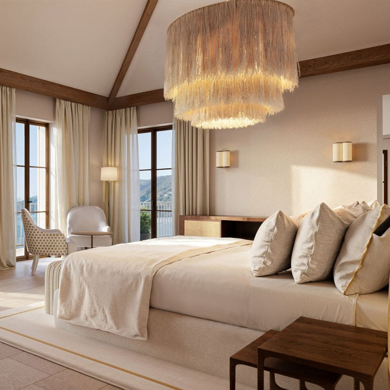 The architecture of Gran Hotel Margalida is defined by its dialogue with the surrounding environment. Stone walls, weathered textures, and traditional construction techniques anchor the property in its historical context, while contemporary interventions introduce openness and fluidity. Large windows and terraces frame uninterrupted sea views, dissolving the boundaries between interior and exterior. The design embraces a minimalist Mediterranean aesthetic, where natural materials such as local stone, wood, and linen create a tactile, sensory experience. Light becomes an architectural element in itself, shifting throughout the day and casting a soft, golden glow across the interiors.