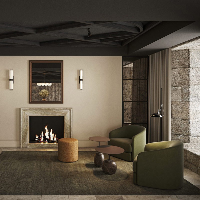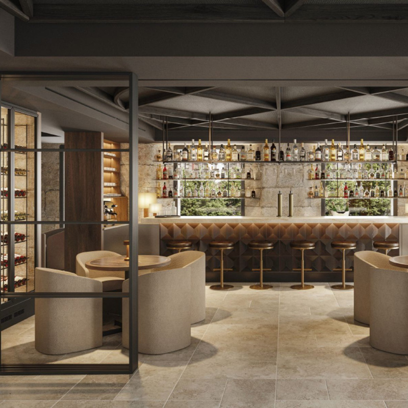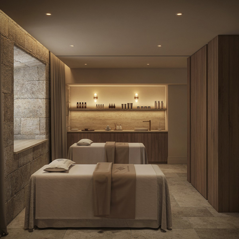 The architectural vision, led by Trenchs Studio, carefully balances preservation and innovation. Original stone walls, historical details, and the palace’s noble proportions have been restored with precision, while interiors introduce a contemporary, minimalist aesthetic. Natural materials such as wood and stone interact with soft lighting and neutral tones, creating a serene, almost meditative atmosphere. Subtle references to the region’s heritage appear throughout, from textures inspired by vineyard landscapes to patterns echoing the building’s original tiles, forming a narrative that connects past and present.