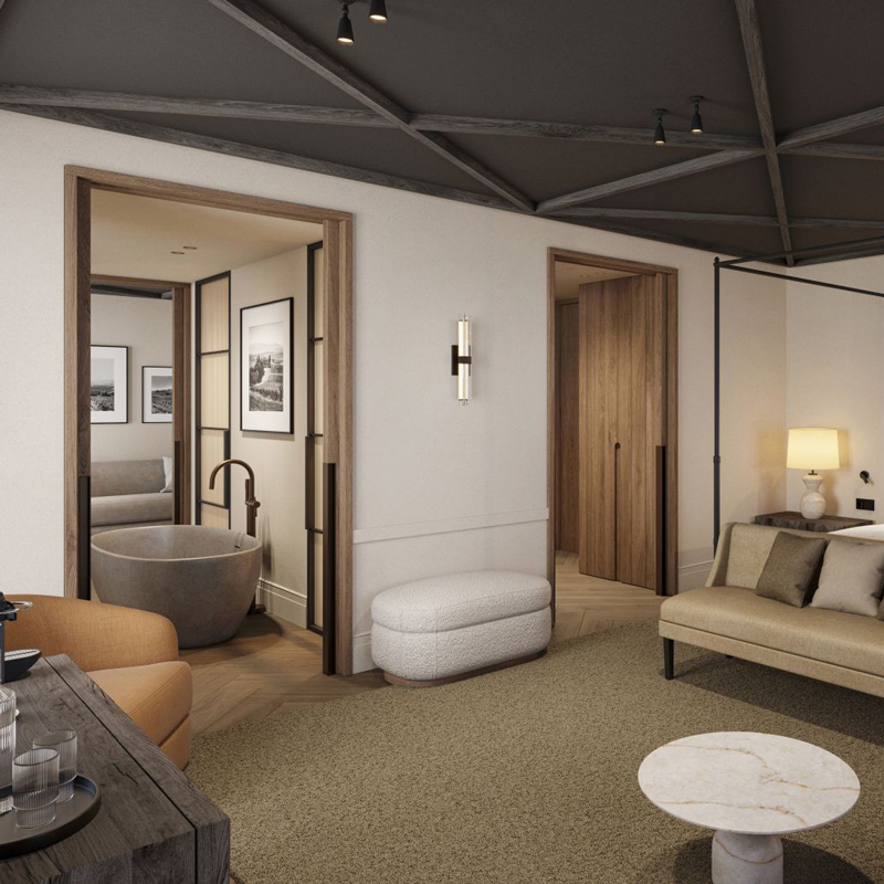 The hotel features 38 rooms alongside 10 private residences located in an adjacent building, offering an elevated level of space and privacy. Each accommodation is designed with a contemporary yet warm aesthetic, where natural light enhances textures and materials. Rooms range from elegant Superior categories to expansive suites with freestanding bathtubs and separate living areas, while the residences cater to longer stays with fully equipped living spaces. Across all categories, the design language remains consistent, blending understated luxury with a deep sense of place.