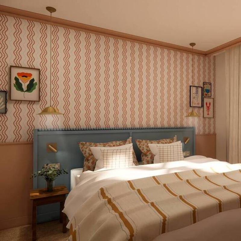 The hotel offers a collection of bright, air-conditioned rooms, accessible by elevator and designed for comfort and simplicity. While the exact number of rooms is not officially specified, each space reflects the same design language — combining decorative wallpaper, vintage touches, and functional amenities. Rooms are conceived as intimate retreats after a day by the sea, offering a relaxed and welcoming atmosphere rather than overt luxury. The focus is on light, ease, and a sense of place — true to the spirit of a coastal getaway.