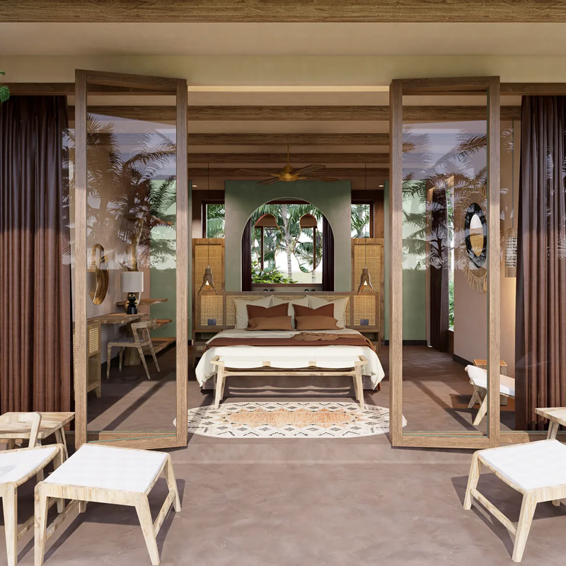 Set against the backdrop of powder‑white beaches and the turquoise expanse of the Indian Ocean, Joud by the Sea combines contemporary design with a deep respect for place. The architecture embraces clean lines, natural materials, and breezy indoor‑outdoor transitions that invite sea breezes and soft light into every space. Textures such as light‑washed timber, raffia, linen, and local stone work in harmony with the soft curves of the coastline. Shades of sand, ocean blue, and warm neutrals draw the landscape inside, creating a visual language that feels both fresh and deeply rooted in Zanzibar’s aesthetic. Communal spaces, beachside lounges, and shaded verandas are conceived as extensions of the shoreline itself — areas to gather, to rest, and to watch the changing tapestry of light and tide.