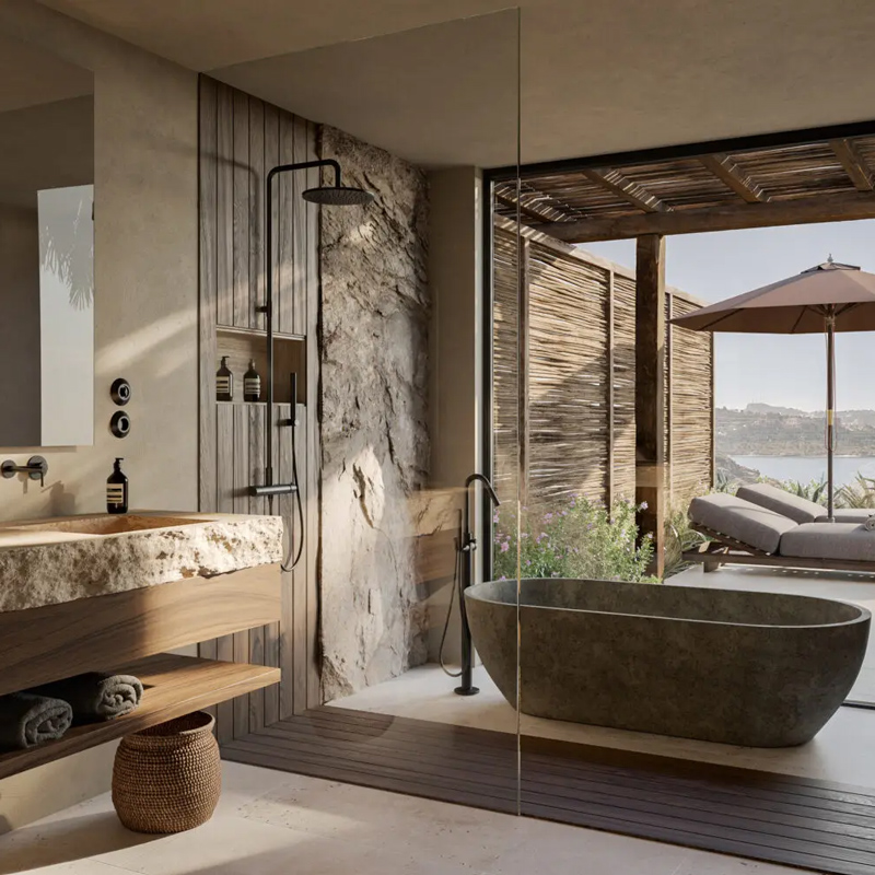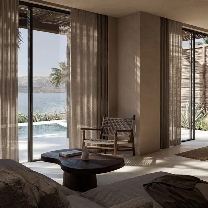 Spanning a panoramic hillside, the architecture by AEM Architecture, paired with interiors by OKU’s in-house design team, reflects a refined interpretation of coastal minimalism. Natural textures, soft earth tones, and open spaces define the aesthetic, allowing the surrounding landscape to take center stage. Clean lines are softened by organic materials, while terraces and large openings frame uninterrupted sea views. The result is a seamless dialogue between structure and setting, where every detail feels intentional and deeply connected to the environment.