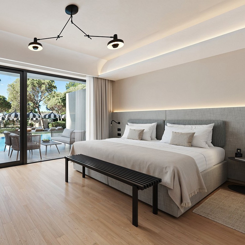 The resort’s architecture draws inspiration from its breathtaking coastal setting, with modern forms that echo the fluid lines of the sea and surrounding landscape. Thoughtfully arranged across three distinct properties, contemporary rooms and suites showcase stunning views of the Adriatic and Mediterranean gardens. Interiors are designed to feel both open and intimate, balancing luxury with effortless comfort that invites relaxation at every turn.
