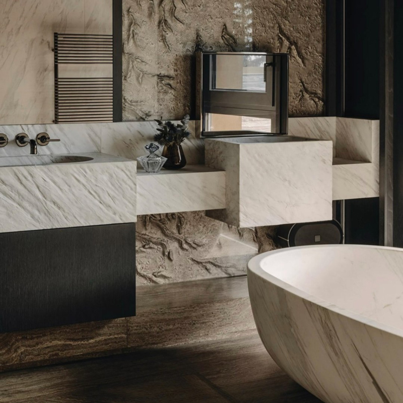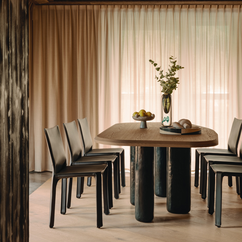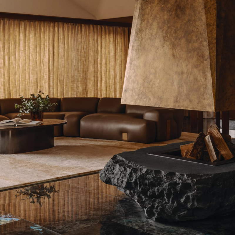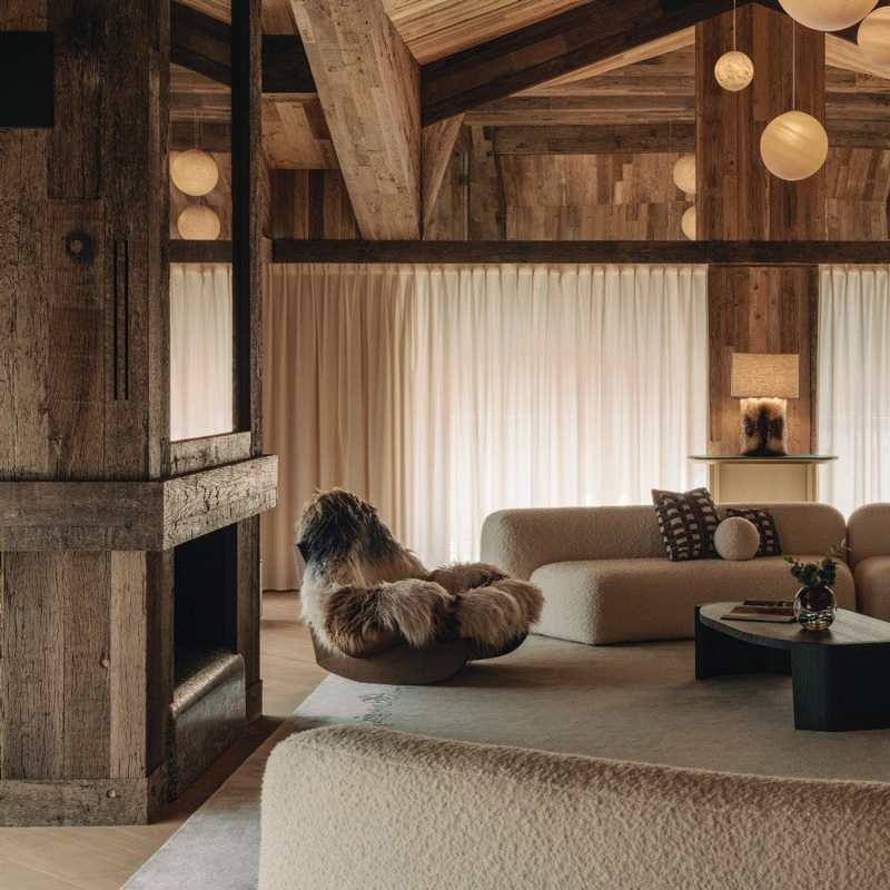 Imagined by renowned French designer Tristan Auer, the hotel takes the form of a contemporary alpine chalet, crafted with meticulous attention to texture, light, and emotion. The architecture blends seamlessly into its surroundings, combining timber, stone, and quartzite with warm copper accents. Inside, spaces unfold like a private residence — intimate yet subtly theatrical — where sculptural fireplaces, carved wood details, and curated artworks create a refined yet inviting atmosphere. A striking installation by Olafur Eliasson adds a poetic dimension, playing with reflection and perception in a way that feels both modern and deeply immersive. In a deliberate layering of creative visions, the property also features a signature private residence imagined by Studio KO, whose architectural rigor introduces a sharper, more sculptural counterpoint to Tristan Auer’s warm alpine narrative.