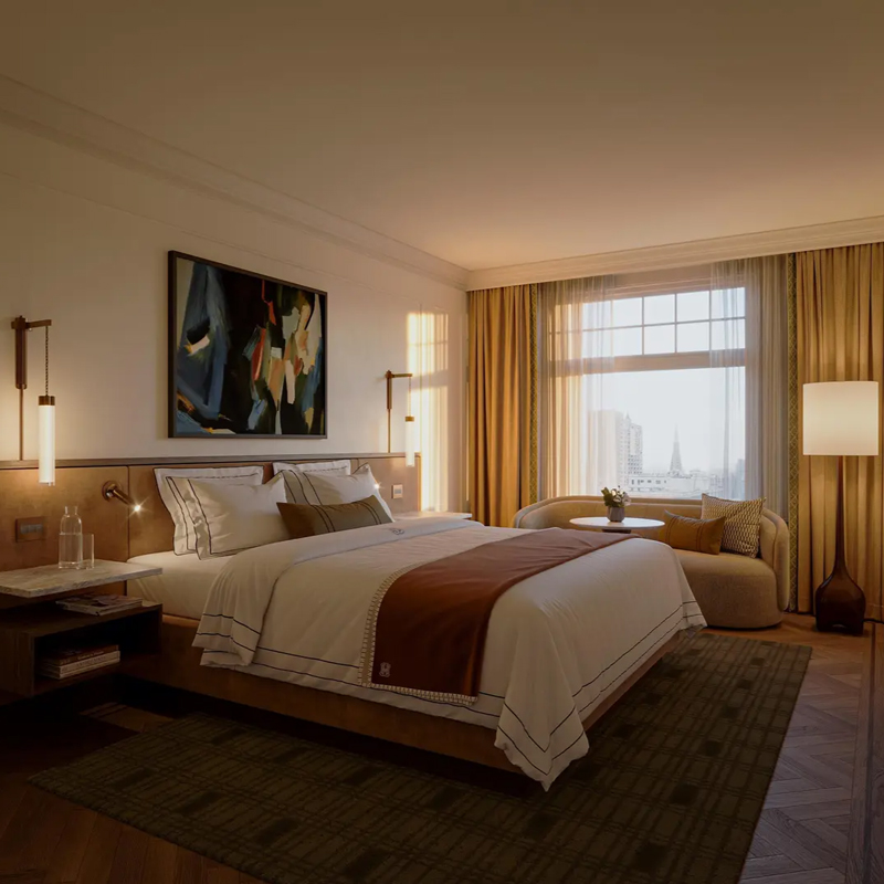 The reimagined property features 71 guest rooms and 72 suites, including expansive one-bedroom configurations and a signature penthouse overlooking the city. Each accommodation has been designed to feel intimate and residential, with soft palettes, bespoke furnishings, and carefully considered lighting that enhances the sense of calm. Large windows frame views of Nob Hill or Huntington Park, while marble bathrooms and thoughtful layouts elevate the experience. The overall aesthetic balances heritage with comfort, creating spaces that feel both timeless and quietly indulgent.