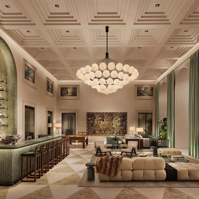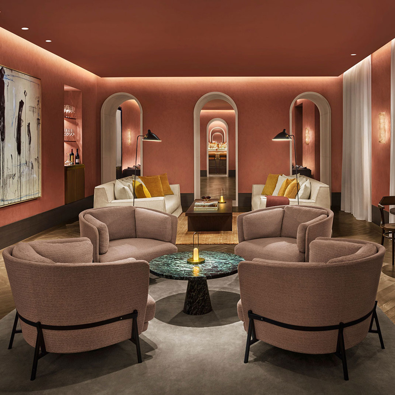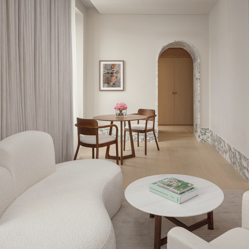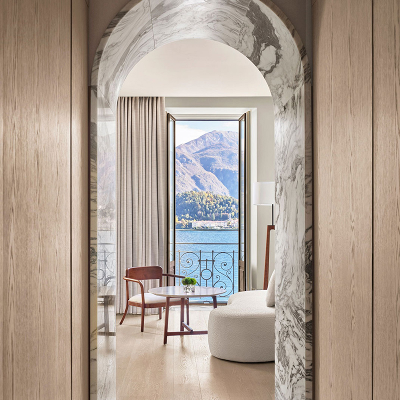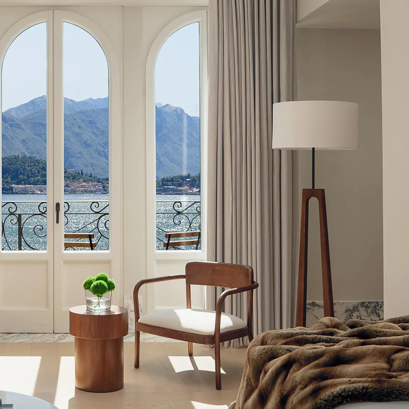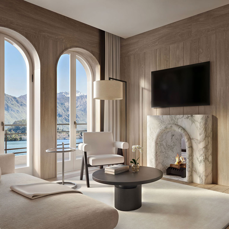 Step inside and you’ll find an architecture that speaks in soft dialogue with its historic bones. Internationally acclaimed design collaborators Neri&Hu — alongside EDITION’s creative leads — have adorned the hotel with a refined palette that draws from the lake’s own hues: whispering lake‑blue tones, refined Calacatta marble, natural walnut detailing, and artful accents that echo the landscape outside. Through vaulted archways and floor‑to‑ceiling windows, light travels freely, blurring the line between interior surfaces and the panoramic world beyond. Every space feels curated — a testament to design that is aesthetically bold yet serenely understated.