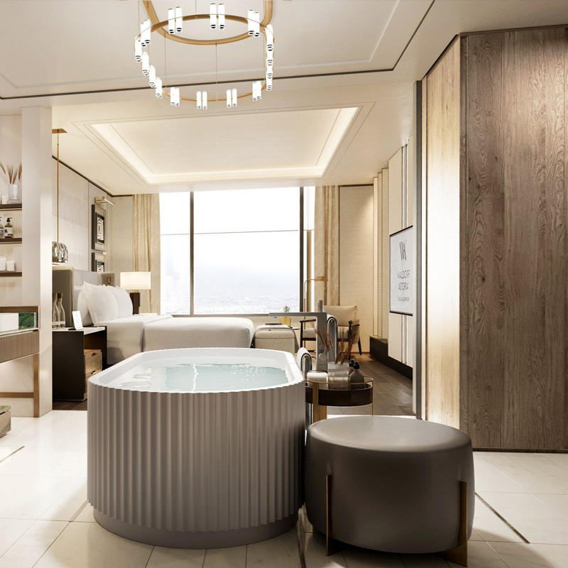 The hotel will feature 279 suites, each starting from an impressive 80 square meters, positioning it among the most spacious luxury offerings in the city. Each suite is conceived as a private residence in the sky, with generous living areas, refined finishes, and panoramic views over Kuala Lumpur. The all-suite concept reinforces a sense of exclusivity, offering both comfort and privacy within a highly urban environment. Custom-designed décor and furnishings define these expansive spaces, where neutral palettes are elevated by Verde Alpi marble-inspired accents and a refined interplay of textures, light, and shadow. Imagined by LW Design, each suite reflects a modern Asian retreat, blending intuitive layouts with tailored, contemporary elegance. A sculptural pivoting upholstered television wall subtly connects the living room and bedroom, enhancing spatial fluidity, while carefully curated artworks introduce layers of color and texture, adding depth, warmth, and a distinctly refined character to every interior.